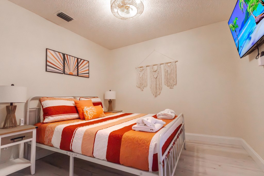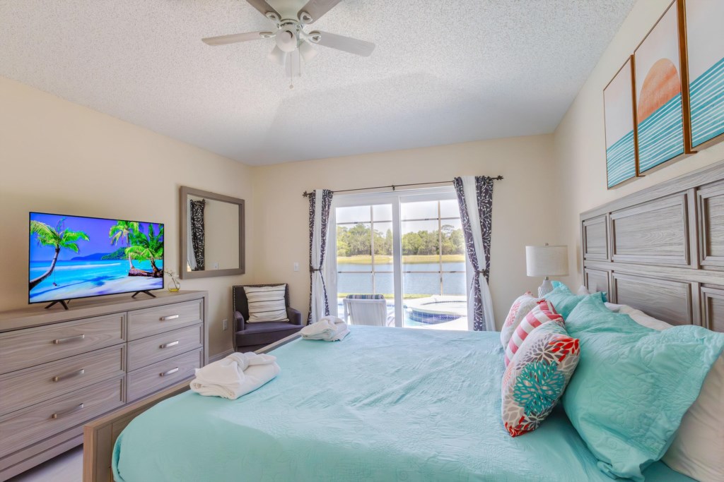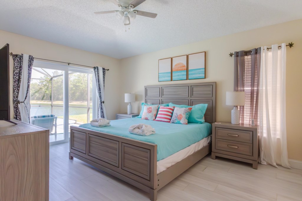 Step inside a bright, open-plan layout featuring clean vinyl flooring and tile throughout, complemented by elegant tropical boho décor and cozy furnishings. On the right side of the home, the peaceful master suite provides a private retreat, complete with a king-size bed dressed in fresh, crisp linens and sliding doors that open directly to the pool deck. The ensuite bathroom includes a soaking bathtub, walk-in shower, and a generous walk-in closet.