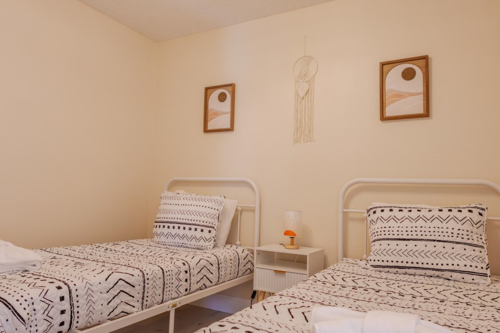 On the opposite side of the villa are three additional bedrooms: a comfortable queen bedroom adjacent to the pool area, and two stylish twin bedrooms; all designed with the same fresh, calming aesthetic. These bedrooms share a well-appointed bathroom with a tub/shower combination. Each bedroom is equipped with ceiling fans and smart TVs.