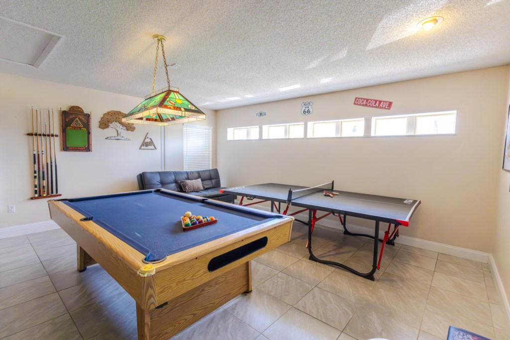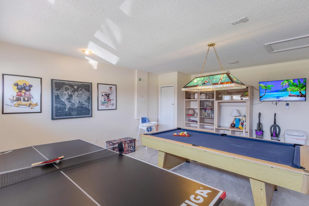 The main family room overlooks stunning lake views with surrounding natural beauty, as well as a children’s play area across the water and a scenic walking path that loops around the lake. Step outside to enjoy the east-facing private pool and spa—perfect for morning swims, sunny afternoons, or winding down after an adventurous day out. For added entertainment, the game room offers a pool table, a ping pong table, and a wall-mounted TV, making it a hit with guests of all ages.