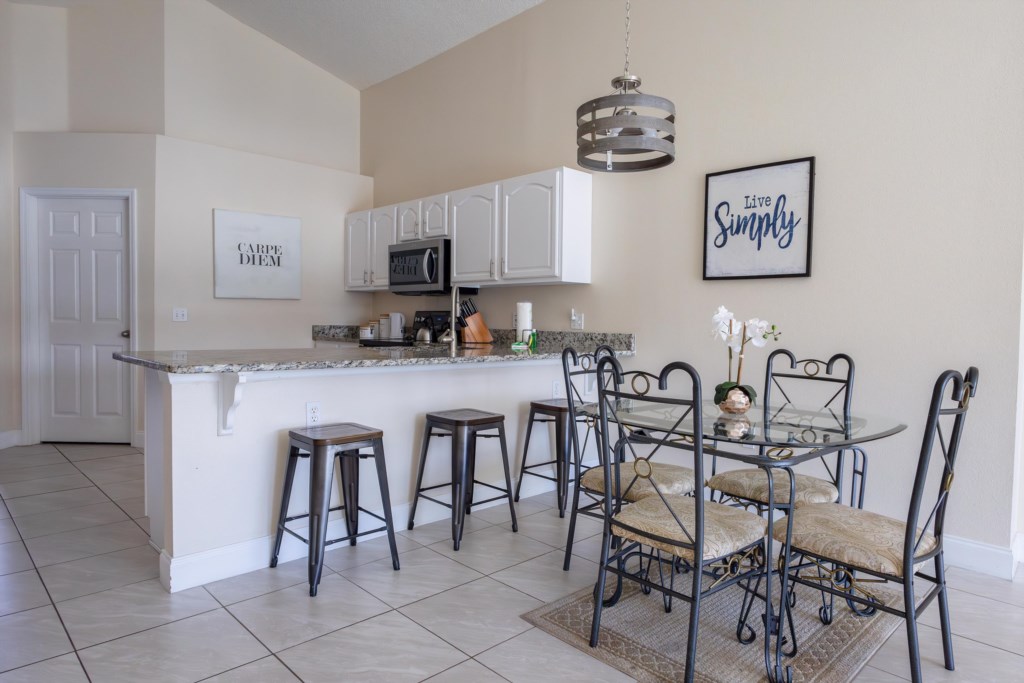 The home offers spaces to gather but is roomy enough to spread out and enjoy privacy. The front dining area comfortably seats six and features charming window seating, flowing into a separate lounge with a couch and a large smart TV—ideal for quiet evenings or movie nights. Toward the back of the villa, the fully equipped kitchen provides everything you need for self-catering, including all major appliances, a Keurig coffee maker, toaster, kettle, breakfast bar, and a cozy kitchen dining nook.