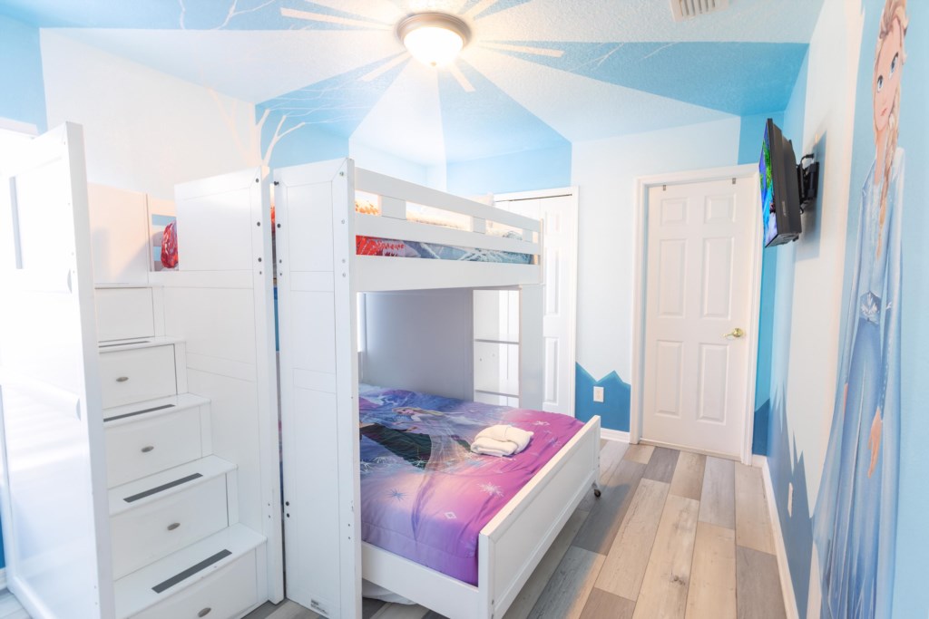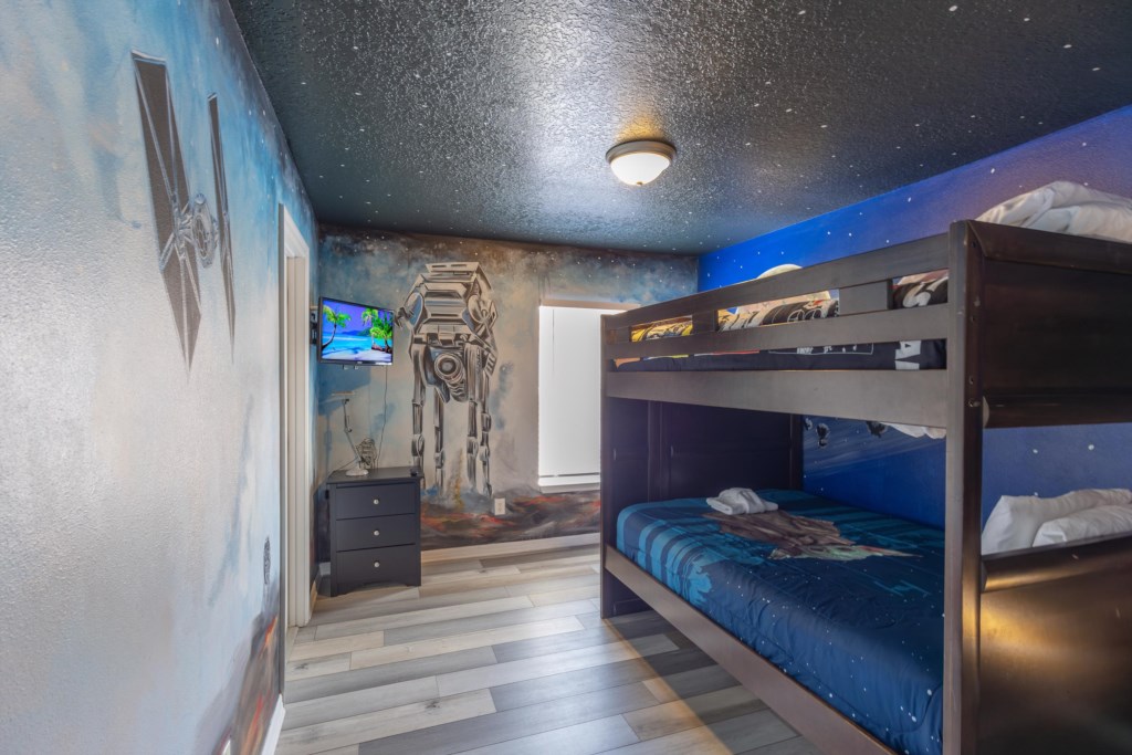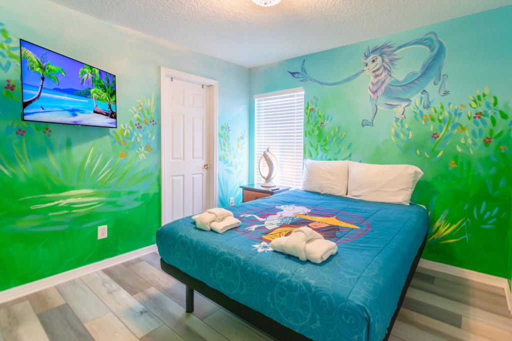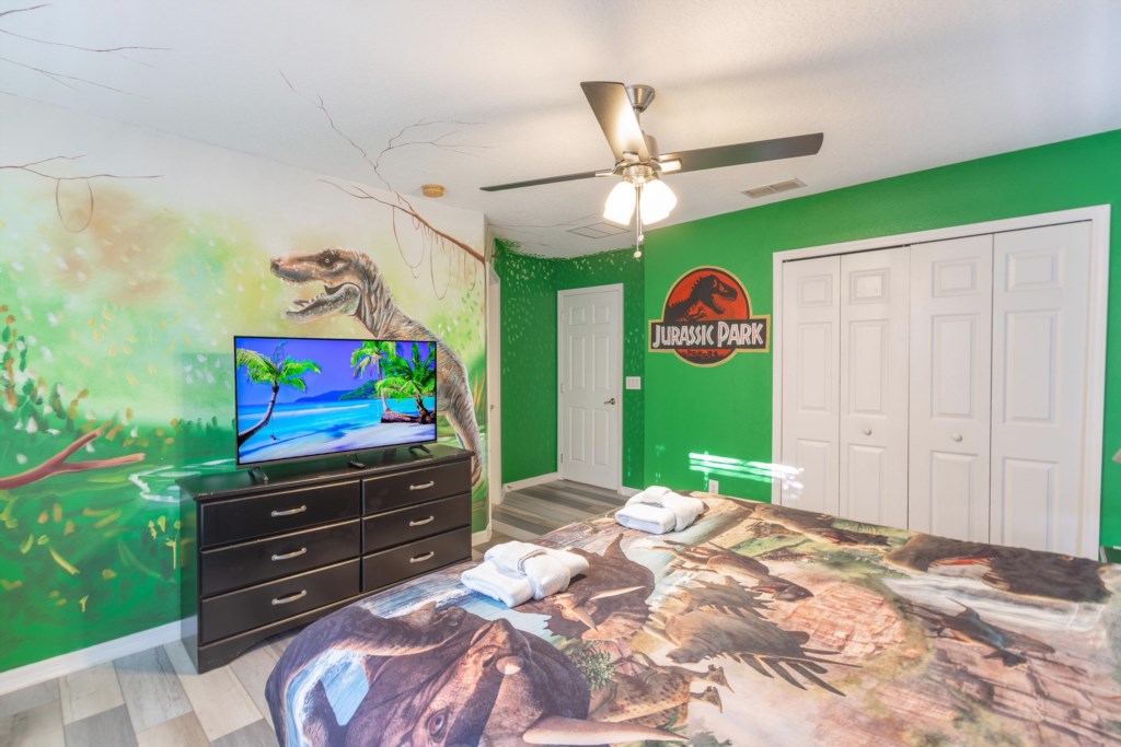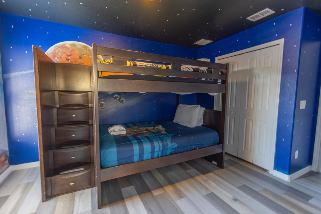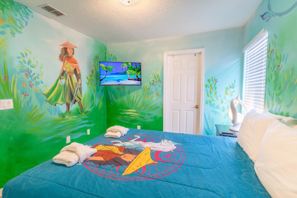 Welcome to this very exciting and unique movie themed home! Yes, you can feel like you're in the movies while you enjoy so many things this gigantic villa has to offer. As soon as you enter, you'll be wowed by the colossal boat that actually makes up the huge dining table in the Pirates of the Caribbean themed dining room. There is plenty of dining seating for all guests. You'll then walk through to the very well equipped and roomy kitchen area, which features a breakfast bar with four bar stools. The kitchen and adjacent family room lead out to the private pool area. The Avatar themed family room includes a colossal and very comfortable couch, a decent sized television with cable package, and a coffee table. As entertainment extras, you'll enjoy gaming with family and friends with the full-sized pool table in this area, as well as a foosball table on the loft area! There is also a convenient half bathroom. All six bedrooms are located upstairs, and they have character you have to see to believe! The two master suites with en-suite bathrooms are Harry Potter and Jurassic Park themed and have king size beds. There are two queen bed suites with private en-suite bathrooms, which are themed Beauty and the Beast and Raya and the Last Dragon. The two other bedrooms with bunk beds share a bathroom and are Frozen and Star Wars themed. There's something for everyone and you'll totally be captured by the imagination and inspiration of the place. To top it all off, the pool area is epic! You'll walk out into the nicely shaded lanai area with dining table and BBQ grill (optional extra). The pool area is surrounded by a peaceful conservation area and also guarded by a safety fence to keep the precious little ones safe. The pool and spa/jacuzzi can be heated if desired and includes lighting for a relaxing evening splash, as well as plenty of other outdoor lighting to maximize the time you can spend making the most of this fantastic outdoor space. What's more is the spa/jacuzzi is equipped with jets you can operate to also heat the spa to a higher temperature than the pool. Other beneficial features well worthy of noting are the large driveway that can accommodate four average sized cars, the vinyl flooring throughout for extra cleanliness, and the two floors have separate air conditioning units for extra comfort.