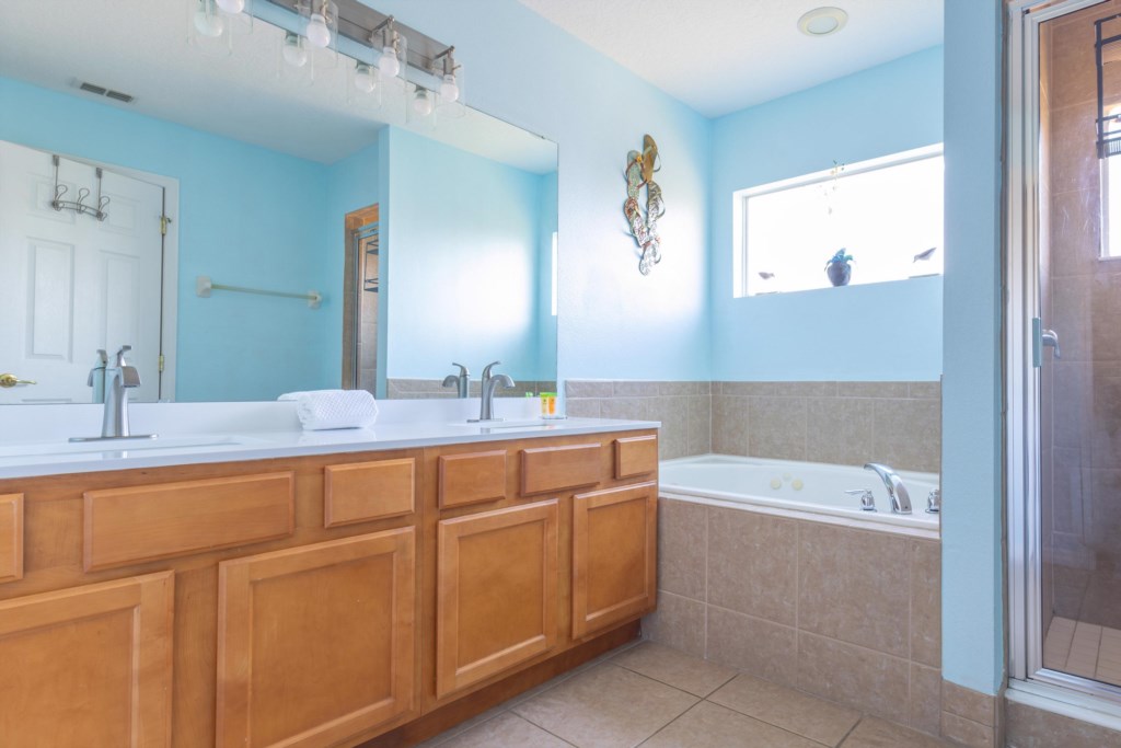 Located in Bella Vida Resort, including the magnificent clubhouse that spans over 6,700 square feet with a community pool. There are also 15 acres of gorgeous lakes, a cyber café, game room for the kids, basketball courts, volleyball, walking trails, places for picnics, playground for little ones and spectacular Italian gardens. All of the onsite facilities are included with your stay. The gate has 24/7 security for your peace of mind. There is a Walmart Supercenter only 0.6 miles away.